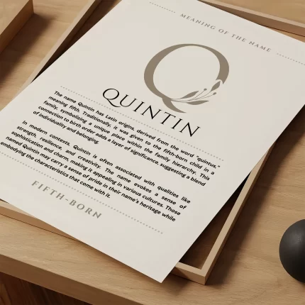 The name Quintin has Latin origins, derived from the word "quintus," meaning fifth. Traditionally, it was given to the fifth-born child in a family, symbolizing a unique place within the family hierarchy. This connection to birth order adds a layer of significance, suggesting a blend of individuality and belonging. In modern contexts, Quintin is often associated with qualities like strength, resilience, and creativity. The name evokes a sense of sophistication and charm, making it appealing in various cultures. Those named Quintin may carry a sense of pride in their name's heritage while embodying the characteristics that come with it.