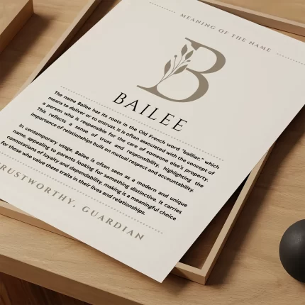Embrace the significance of the name Bailey with this beautifully crafted name art. Featuring elegant typography and a thoughtful design, this piece highlights the meaning and origin of the name, making it a perfect gift for loved ones or a unique addition to your home decor. Embrace individuality and heritage today.